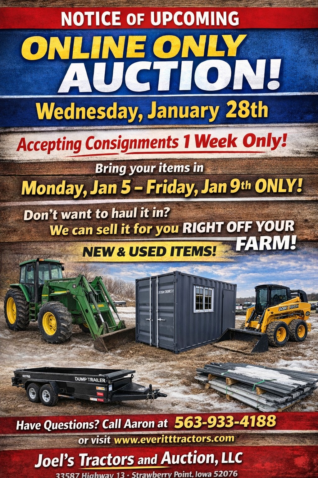 Items left after 30 days will be considered abandoned, destroyed, resold, or up to the discretion of Joel's Tractors and Auction, LLC.